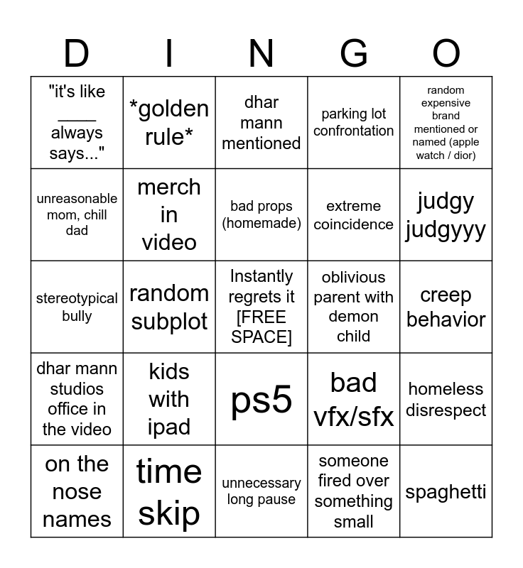 This bingo card has a free space and 40 words: dhar mann voiceover, stereotypical bully, "you see" / "so you see", merch in video, time skip, ps5, bad props (homemade), flashback, random expensive brand mentioned or named (apple watch / dior), dhar mann studios office in the video, random subplot, parking lot confrontation, spaghetti, creep behavior, oblivious parent with demon child, kids with ipad, cartoon supervillain, "it's like ____ always says...", continuity error, dhar mann mentioned, homeless disrespect, someone fired over something small, extreme coincidence, unreasonable mom, chill dad, bad voice dubbing, random unrelated content, bad green screen, sexism, racism, Karenn, unrelated lesson to the story, on the nose names, shameless plug, bad vfx/sfx, judgy judgyyy, unnecessary long pause, STOP!!, random intense moment, *golden rule* and not my problem.