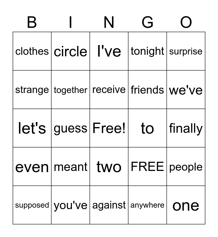 This bingo card has a free space and 25 words: meant, against, receive, supposed, surprise, clothes, strange, circle, to, two, friends, let's, FREE, people, together, none, finally, I've, we've, guess, one, you've, even, tonight and anywhere.