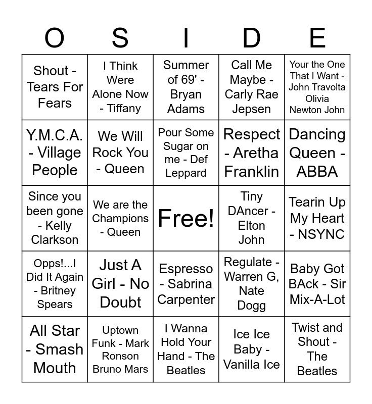 This bingo card has a free space and 74 words: Dont Stop Believin' - Journey, Africa - TOTO, Summer of 69' - Bryan Adams, Livin' on a Prayer - Bon Jovi, You Give Love a Bad Name - Bon Jovi, I Love Rock & Roll - The Black Jets, Sweet Child O' Mine - Guns N Roses, We Built This City - Starship, All Star - Smash Mouth, Sweet Me Up Buttercup - The Foundations, I Want It That Way - BackStreet Boys, Jessie's Girl - Rick Springfield, Pour Some Sugar on me - Def Leppard, Y.M.C.A. - Village People, Free Fallin - Tom Petty, We are the Champions - Queen, Love Shack - The B-52's, Dancing Queen - ABBA, Shake it Off - Taylor Swift, Since you been gone - Kelly Clarkson, We Will Rock You - Queen, I Think Were Alone Now - Tiffany, Call Me Maybe - Carly Rae Jepsen, Wonderwall - Oasis, Twist and Shout - The Beatles, Louie Louie - The Kingsmen, I Wanna Dance with Somebody - Whitney Houston, Whats Up - 4 Non Blondes, Total Eclipse of the Heart - Bonnie Tyler, The Shoop Shoop Song - Betty Everett, Your the One That I Want - John Travolta Olivia Newton John, Sugar Sugar - The Archies, Man! I Feel Like A Woman - Shania Twain, Faith - George Micheal, These Boots are Made for Walking - Nancy Sinatra, Ice Ice Baby - Vanilla Ice, Fight For Your Right - Beastie Boys, Party in the USA - Miley Cyrus, Hold On - Wilson Phillips, Billie Jean - MJ, I Wanna Hold Your Hand - The Beatles, Uptown Funk - Mark Ronson Bruno Mars, Fireworks - Katy Perry, Poker Face - Lady GaGa, ...Baby One More Time - Britney Spears, Shout - Tears For Fears, Shout - The Isley Brothers, Just A Girl - No Doubt, You Oughta Know - Alanis Morissette, La Bamba - Ritchie Valens, I Got You Babe - Sonny & Cher, MArgarittaville - Jimmy Buffet, Tearin Up My Heart - NSYNC, Piano Man - Billy Joel, KArma Chameleon - Culture Club, Wake Me Up Before Ya GO GO - Wham!, Espresso - Sabrina Carpenter, HOT TO GO - Chappell Roan, Kiss - Prince, Baby Got BAck - Sir Mix-A-Lot, Respect - Aretha Franklin, Bad Romance - LAdy GAGA, Opps!...I Did It Again - Britney Spears, Just A Friend - Biz Markie, Tiny DAncer - Elton John, Hey There Delilah - Plain White T's, Escape - Rupert Holmes, Die with a Smile - LAdy GAGA, Bruno MArs, Regulate - Warren G, Nate Dogg, TIK TOK - Kesha, Part of Your World - Jodi Benson, You Belong With Me - Taylor Swift, No Scrub - TLC and Shallow - LAdy GAGA, Bradley Cooper.