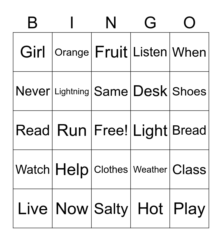 This bingo card has a free space and 24 words: Help, Now, Same, Live, When, Girl, Never, Orange, Light, Clothes, Desk, Read, Weather, Class, Lightning, Hot, Bread, Fruit, Shoes, Run, Play, Watch, Listen and Salty.