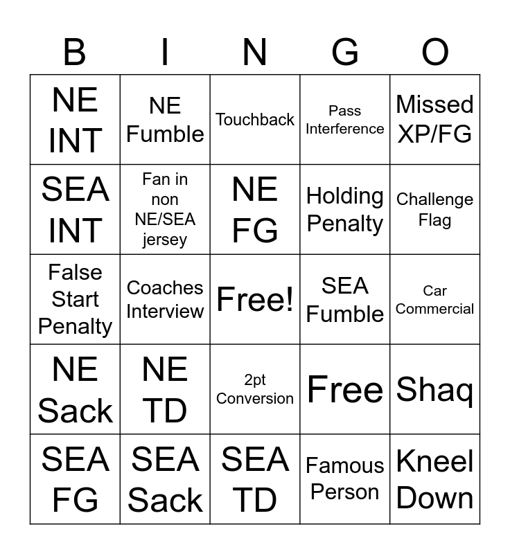 This bingo card has a free space and 25 words: NE TD, SEA TD, NE FG, SEA FG, Missed XP/FG, NE INT, SEA INT, NE Fumble, SEA Fumble, 2pt Conversion, Holding Penalty, False Start Penalty, Free, Shaq, Fan in non NE/SEA jersey, Beer Commercial, Car Commercial, Touchback, Challenge Flag, Coaches Interview, Kneel Down, SEA Sack, NE Sack, Pass Interference and Famous Person.