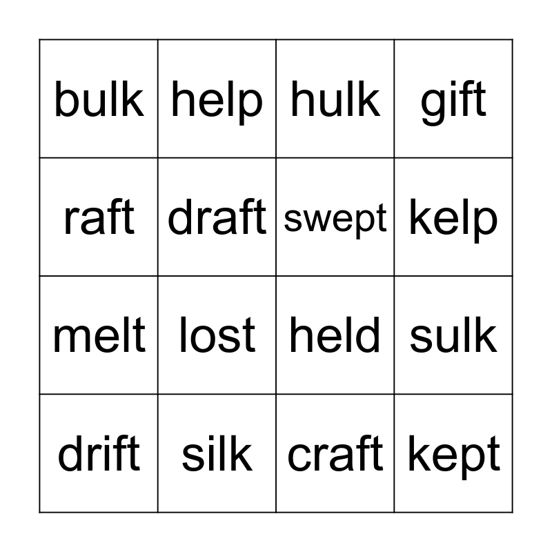 This bingo card has 16 words: silk, sulk, hulk, bulk, melt, help, held, craft, raft, draft, drift, gift, lost, kelp, swept and kept.