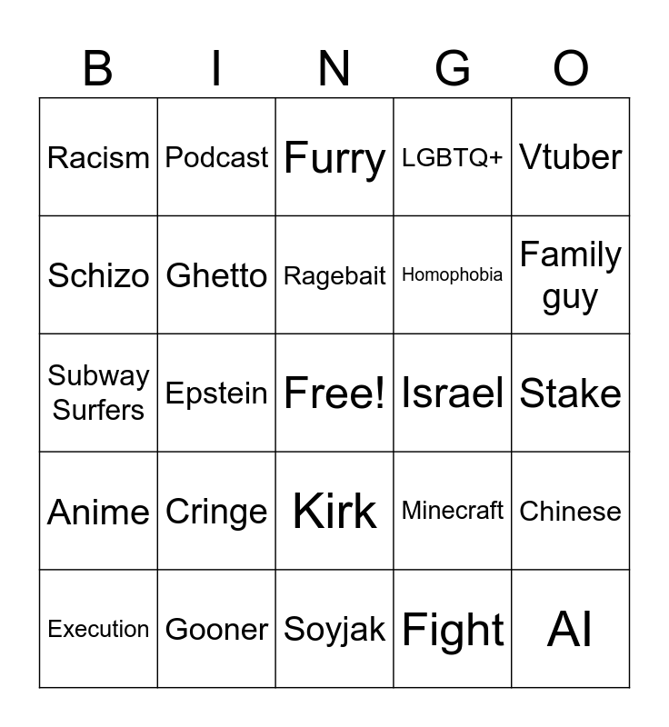 This bingo card has a free space and 24 words: Cringe, Gooner, Ragebait, Execution, Vtuber, Racism, Schizo, Podcast, Israel, Kirk, Homophobia, Subway Surfers, Minecraft, Chinese, Ghetto, Fight, Stake, Furry, Family guy, Epstein, AI, Anime, LGBTQ+ and Soyjak.