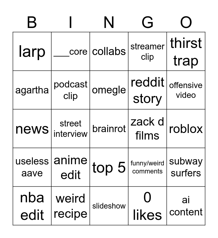 This bingo card has a free space and 24 words: anime edit, weird recipe, omegle, nba edit, thirst trap, larp, agartha, ___core, zack d films, top 5, reddit story, news, funny/weird comments, subway surfers, podcast clip, 0 likes, roblox, collabs, offensive video, street interview, ai content, useless aave, streamer clip and slideshow.