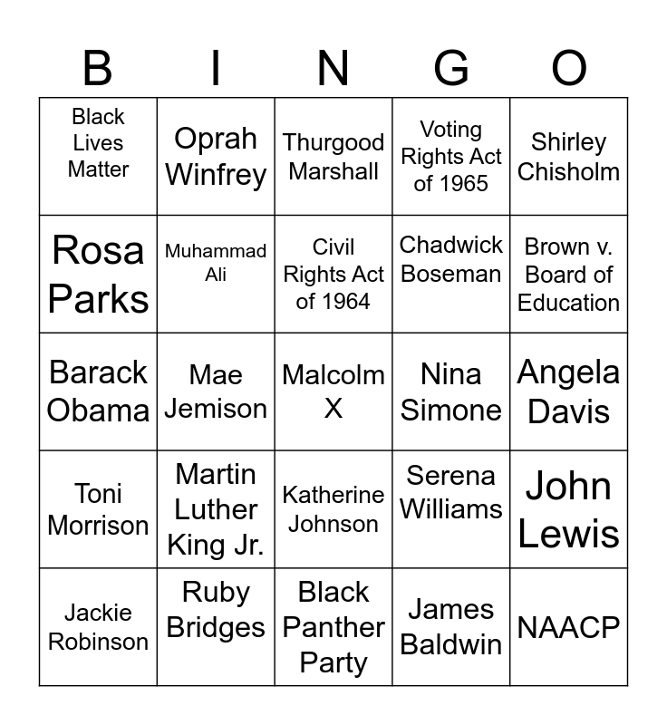 This bingo card has a free space and 24 words: Martin Luther King Jr., Ruby Bridges, Civil Rights Act of 1964, Jackie Robinson, Shirley Chisholm, Black Lives Matter, Rosa Parks, Oprah Winfrey, Nina Simone, Katherine Johnson, Chadwick Boseman, Barack Obama, Serena Williams, John Lewis, Muhammad Ali, James Baldwin, Angela Davis, Thurgood Marshall, Brown v. Board of Education, Mae Jemison, NAACP, Toni Morrison, Voting Rights Act of 1965 and Black Panther Party.