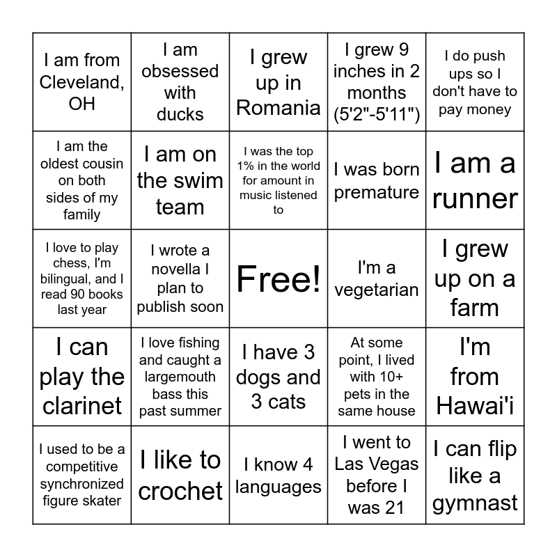 This bingo card has a free space and 49 words: I collect action figures, I can flip like a gymnast, We have a baby - place together with Marielle, I know 4 languages, I love fishing and caught a largemouth bass this past summer, My cats are names after food and I have 2, I am obsessed with ducks, I want to be pescitarian, I am the oldest cousin on both sides of my family, I assisted directed a musical, I am on the swim team, I grew 9 inches in 2 months (5'2"-5'11"), I'm from Hawai'i, At some point, I lived with 10+ pets in the same house, I played baseball and hockey, I played 5 sports in high school, I was the top 1% in the world for amount in music listened to, I'm a vegetarian, My parents didn’t have a name for me when I was first born, so I didn’t have a name for 3 days., I do push ups so I don't have to pay money, I wrote a novella I plan to publish soon, I went to Las Vegas before I was 21, I am from Cleveland, OH, I was born premature, I have 17 siblings, I am a runner, I used to be a competitive synchronized figure skater, I have a birth defect, I have 3 dogs and 3 cats, I can play the clarinet, I have driven a forklet, We have a baby, I used to raise and show goats, I am a starting center on the basketball team, I like to crochet, I have my dogs name tattooed on my hip, I can name all 46 winners of survivor - first and last name, I used to be a gymnast, I grew up on a farm, I love pickles, I stay pretty warm in the cold, Although I grew up in Michigan, I was born in North Carolina, I have two border collies named reign and paige, I just got a new lizard named soup, I love to play chess, I'm bilingual, and I read 90 books last year, I grew up in Romania, I was vegetarian for 5 years, I can't spell charecter (character) and I daytrade and box.