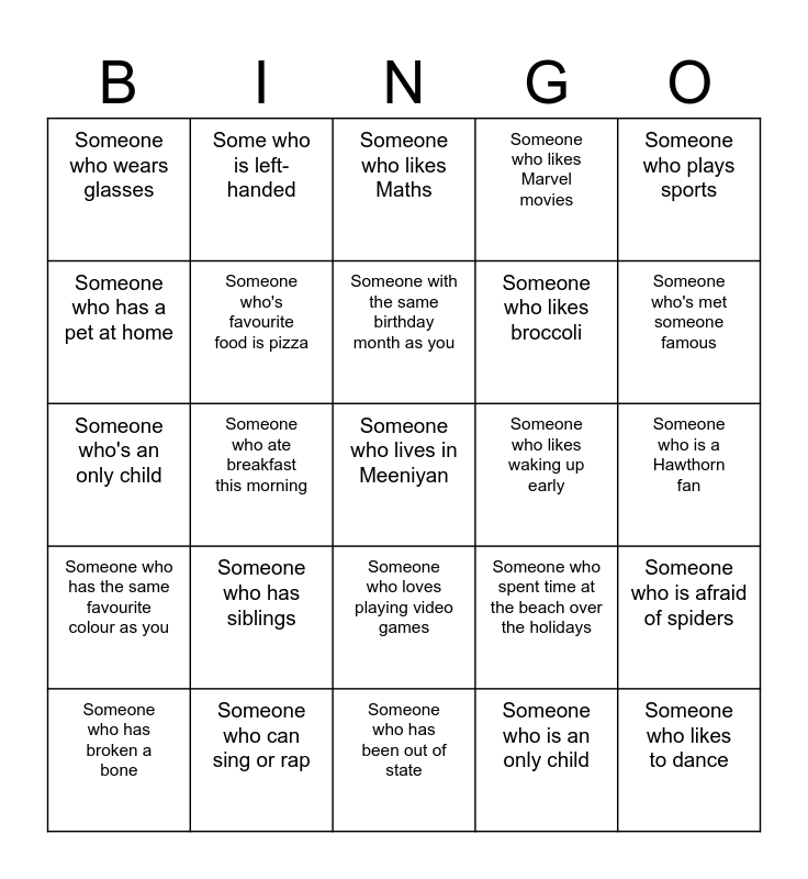 This bingo card has 25 words: Someone who has siblings, Someone who has been out of state, Someone with the same birthday month as you, Someone who has broken a bone, Someone who plays sports, Someone who wears glasses, Someone who has a pet at home, Some who is left-handed, Someone who likes waking up early, Someone who loves playing video games, Someone who likes broccoli, Someone who's an only child, Someone who spent time at the beach over the holidays, Someone who is afraid of spiders, Someone who's favourite food is pizza, Someone who likes to dance, Someone who is a Hawthorn fan, Someone who likes Maths, Someone who's met someone famous, Someone who ate breakfast this morning, Someone who lives in Meeniyan, Someone who can sing or rap, Someone who has the same favourite colour as you, Someone who likes Marvel movies and Someone who is an only child.