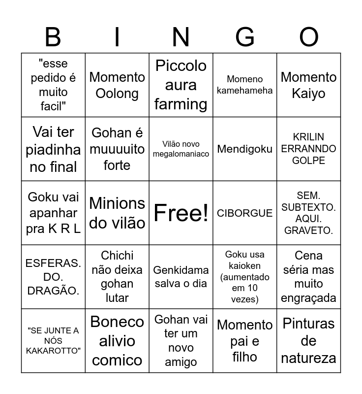 This bingo card has a free space and 24 words: Chichi não deixa gohan lutar, Boneco alivio comico, Vilão novo megalomaniaco, "SE JUNTE A NÓS KAKAROTTO", Momento Kaiyo, "esse pedido é muito facil", Vai ter piadinha no final, Momento Oolong, CIBORGUE, Genkidama salva o dia, Mendigoku, Goku vai apanhar pra K R L, Goku usa kaioken (aumentado em 10 vezes), Cena séria mas muito engraçada, Gohan é muuuuito forte, Momento pai e filho, SEM. SUBTEXTO. AQUI. GRAVETO., Piccolo aura farming, KRILIN ERRANNDO GOLPE, Minions do vilão, Pinturas de natureza, ESFERAS. DO. DRAGÃO., Momeno kamehameha and Gohan vai ter um novo amigo.