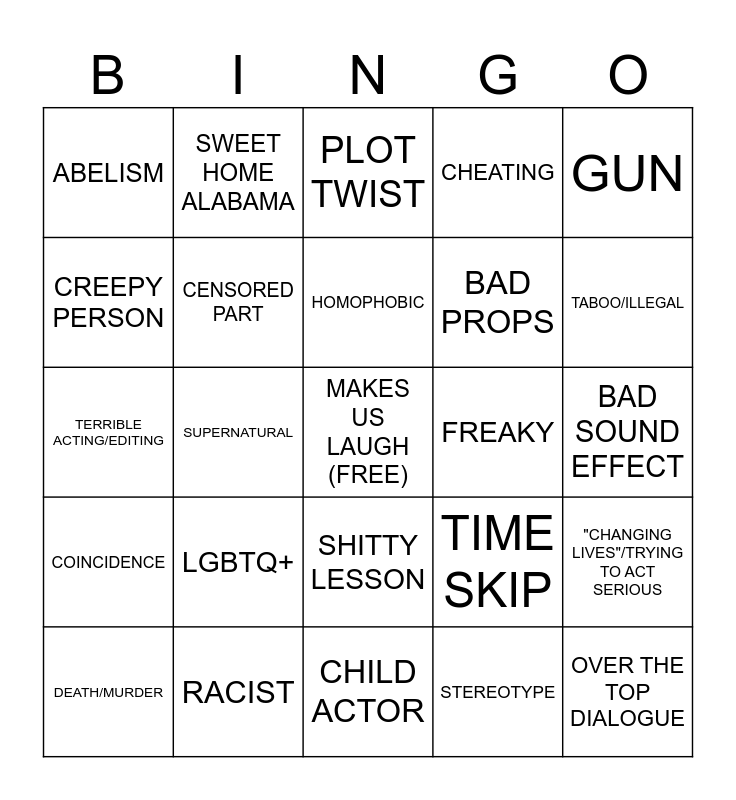 This bingo card has a free space and 24 words: LGBTQ+, RACIST, HOMOPHOBIC, DEATH/MURDER, GUN, ABELISM, CREEPY PERSON, SWEET HOME ALABAMA, FREAKY, SHITTY LESSON, BAD PROPS, TERRIBLE ACTING/EDITING, TIME SKIP, "CHANGING LIVES"/TRYING TO ACT SERIOUS, CENSORED PART, STEREOTYPE, BAD SOUND EFFECT, PLOT TWIST, TABOO/ILLEGAL, SUPERNATURAL, OVER THE TOP DIALOGUE, COINCIDENCE, CHEATING and CHILD ACTOR.