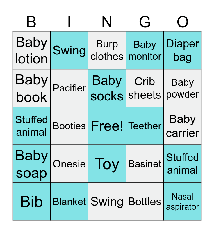 This bingo card has a free space and 24 words: Bib, Onesie, Baby socks, Bottles, Diaper bag, Baby lotion, Swing, Burp clothes, Teether, Baby carrier, Stuffed animal, Pacifier, Basinet, Stuffed animal, Baby book, Blanket, Swing, Baby monitor, Baby powder, Baby soap, Booties, Toy, Crib sheets and Nasal aspirator.