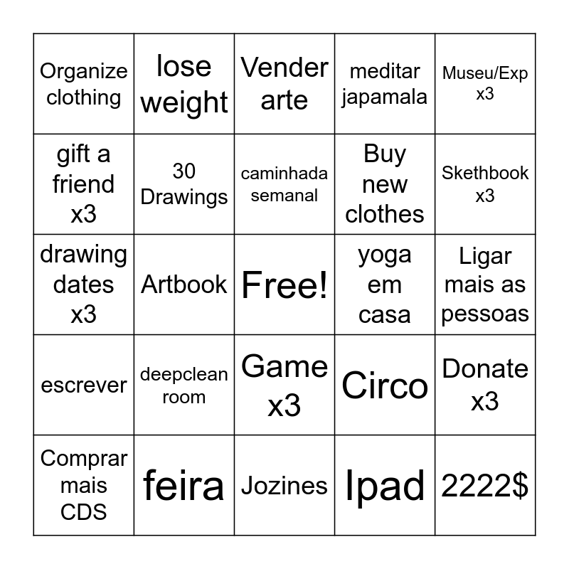 This bingo card has a free space and 24 words: deepclean room, feira, caminhada semanal, Comprar mais CDS, Museu/Exp x3, Organize clothing, gift a friend x3, lose weight, yoga em casa, Game x3, Buy new clothes, drawing dates x3, Circo, Donate x3, 30 Drawings, Ipad, Ligar mais as pessoas, Vender arte, Skethbook x3, Artbook, 2222$, escrever, meditar japamala and Jozines.