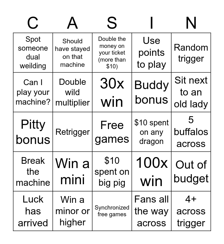 This bingo card has a free space and 24 words: Win a mini, Win a minor or higher, 30x win, Luck has arrived, Random trigger, Spot someone dual weilding, Can I play your machine?, Should have stayed on that machine, $10 spent on any dragon, $10 spent on big pig, Buddy bonus, Pitty bonus, 100x win, Out of budget, Double wild multiplier, Fans all the way across, 5 buffalos across, Double the money on your ticket (more than $10), Sit next to an old lady, Retrigger, 4+ across trigger, Break the machine, Use points to play and Synchronized free games.