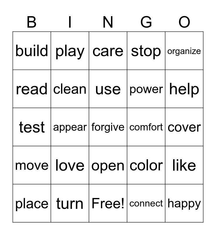 This bingo card has 31 words: Free!, agree, appear, believe, build, care, clean, color, comfort, connect, cover, forgive, happy, harm, help, hope, like, love, move, open, organize, pack, place, play, power, read, stop, test, turn, use and write.