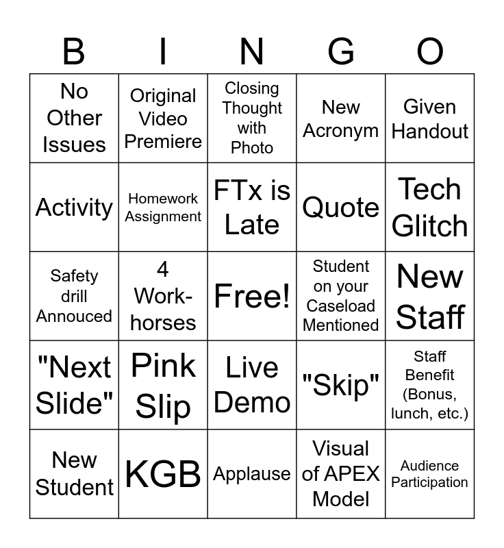 This bingo card has a free space and 27 words: "Skip", Sunshine Commitee, Quote, Applause, Activity, Closing Thought with Photo, Original Video Premiere, "Next Slide", Student on your Caseload Mentioned, Staff Benefit (Bonus, lunch, etc.), Safety drill Annouced, New Acronym, New Student, KGB, Tech Glitch, Shown Video, Homework Assignment, FTx is Late, Pink Slip, No Other Issues, New Staff, Visual of APEX Model, 4 Work-horses, Audience Participation, Live Demo, Given Handout and Less than 3 Closing Thoughts.