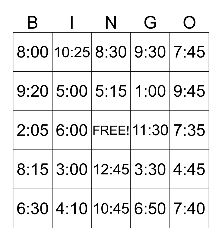 This bingo card has a free space and 24 words: 3:00, 4:10, 5:15, 6:30, 7:45, 8:00, 9:20, 10:25, 11:30, 12:45, 1:00, 2:05, 3:30, 4:45, 5:00, 6:50, 7:35, 8:30, 9:45, 6:00, 7:40, 8:15, 9:30 and 10:45.
