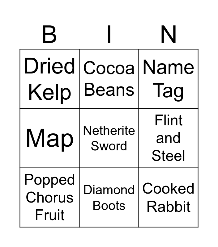 This bingo card has a free space and 8 words: Flint and Steel, Name Tag, Cocoa Beans, Popped Chorus Fruit, Dried Kelp, Cooked Rabbit, Map and Diamond Boots.