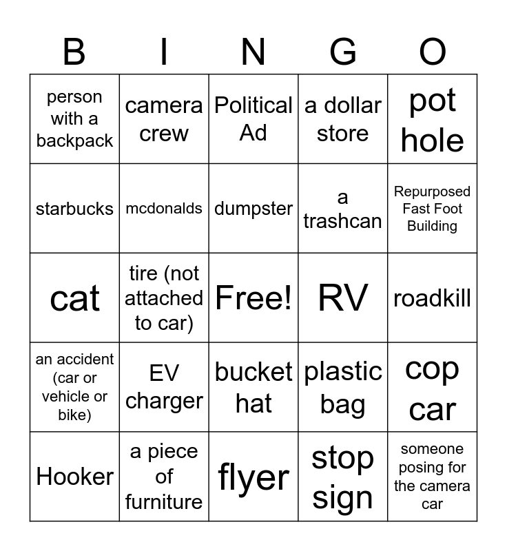 This bingo card has a free space and 60 words: dog, a piece of furniture, an appliance (outdoors), an accident (car or vehicle or bike), stop sign, person crossing street, mcdonalds, subway, a trashcan, a red car, a dollar store, swimming pool, starbucks, 7 eleven, sports field, person with a backpack, someone posing for the camera car, pot hole, school, dumpster, RV, Political Ad, Hooker, cop car, gun (real or fake), apple logo, payphone, traffic cone, Repurposed Fast Foot Building, Walmart, bicycle, dinosaur (real or fake), moose, brewery or bar, camera crew, baby, chic fil a, tire (not attached to car), abandoned car, cat, cactus, EV charger, roadkill, taco bell, plastic bag, quarter/gumball machine, bowling alley, exposed brick building, sneakers on a power line, bucket hat, flyer, some form of cart, exotic car, something burnt or burned down, air vehicle (plane or heli), graffiti, bikini, lifeguard stand, farm animal and homeless person.