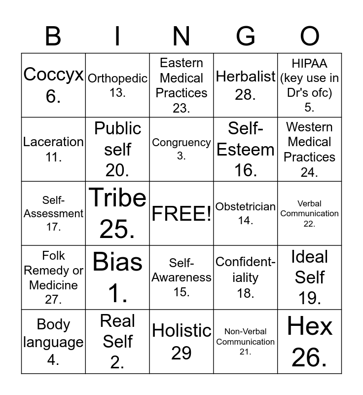 This bingo card has a free space and 24 words: Bias 1., Real Self 2., Congruency 3., Body language 4., HIPAA (key use in Dr's ofc) 5., Coccyx 6., Laceration 11., Orthopedic 13., Obstetrician 14., Self- Awareness 15., Self-Esteem 16., Self- Assessment 17., Confident- iality 18., Ideal Self 19., Public self 20., Non-Verbal Communication 21., Verbal Communication 22., Eastern Medical Practices 23., Western Medical Practices 24., Tribe 25., Hex 26., Folk Remedy or Medicine 27., Herbalist 28. and Holistic 29.