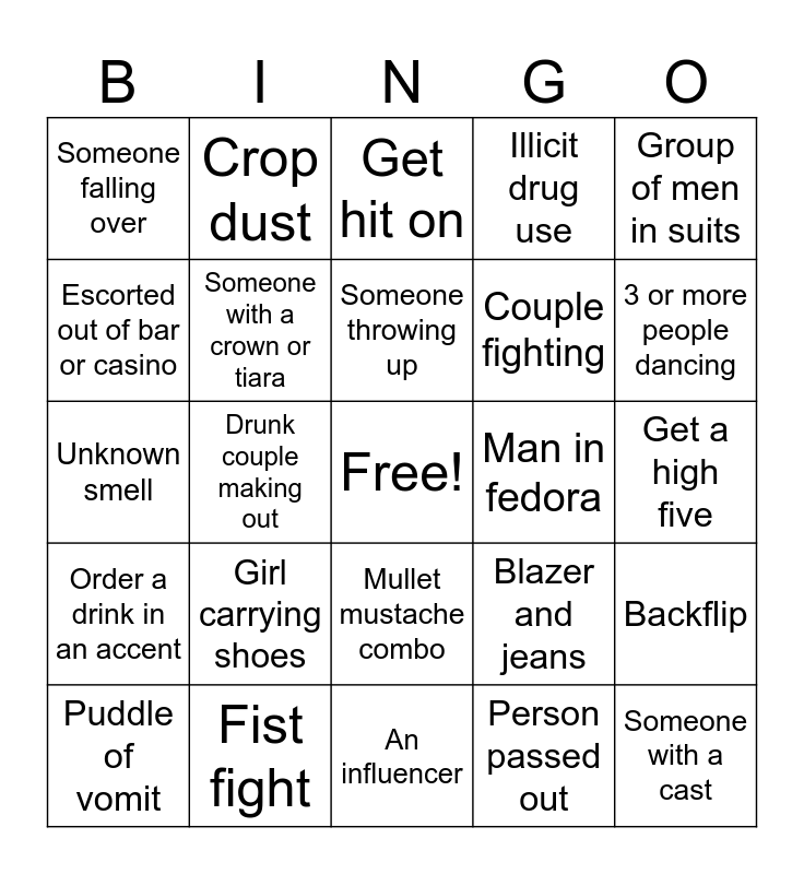 This bingo card has a free space and 95 words: Someone talking to themselves, Cops interrogating someone, Person passed out, Tall drink, We do shots, Someone walking a dog, Tara or sunshine wander, Fist fight, Women yelling at each other, Someone says “cheers”, Someone zip lining, Shirtless man, Bachelorette party, Someone throwing up, Someone giving away beads, Someone falling over, 3 or more people dancing, Free space = take a shot, Someone bleeding, Someone double fisting, A girl pulling her skirt down, Tim talks to a stranger, Sugar daddy, Nick “smirks”, Illicit drug use, Escorted out of bar or casino, Someone crying, Couple fighting, A furry - non street performer, Radar bag, Girl carrying shoes, Family with children, Matching shirts/outfits, Stranger Steve, Puddle of vomit, Tourist with camera around neck, An influencer, Annoyed bartender, Unknown smell, Car honking, Backflip, Drunk couple making out, Mullet mustache combo, Group of men in suits, Blazer and jeans, Man in fedora, Pink pony club plays, Plumber’s crack, Drunk people singing, Group of cigar smokers, Drink a water, Chug your drink, Someone wearing tye dye, Someone wearing fishnets, Someone wearing all sequins, Get carded, Costumed person with their head off, Someone in a Vegas shirt, Cowboy hat, Group of woo girls, Someone with a crown or tiara, Photobomb a selfie, People dancing on bars/tables, Gold chain, Aggressively dancing older person, Bartender flair, Steve name tag on an employee, Get offered drugs, Get hit on, Find money on the ground, Group of military dressed folk, Person in sandals, Someone with a cast, Someone dropping an entire beverage, Someone stealing drinks, Pestered by timeshare folks, Someone on speaker phone, Public urination, “Wow, big tv” when light show starts, Crop dust, Compliment someone’s aura, Man purse, Ask for directions to Fremont while on Fremont, Foreign language, Get a high five, Order a drink in an accent, “Oh that’s [wrong name]” to a performer, Get handed a flyer, Someone with a bowtie, Find someone from Tucson, Send a snapchat, Drink a shot with a straw, Win RPS against a stranger, Someone wearing a wig and Old person wearing spandex.