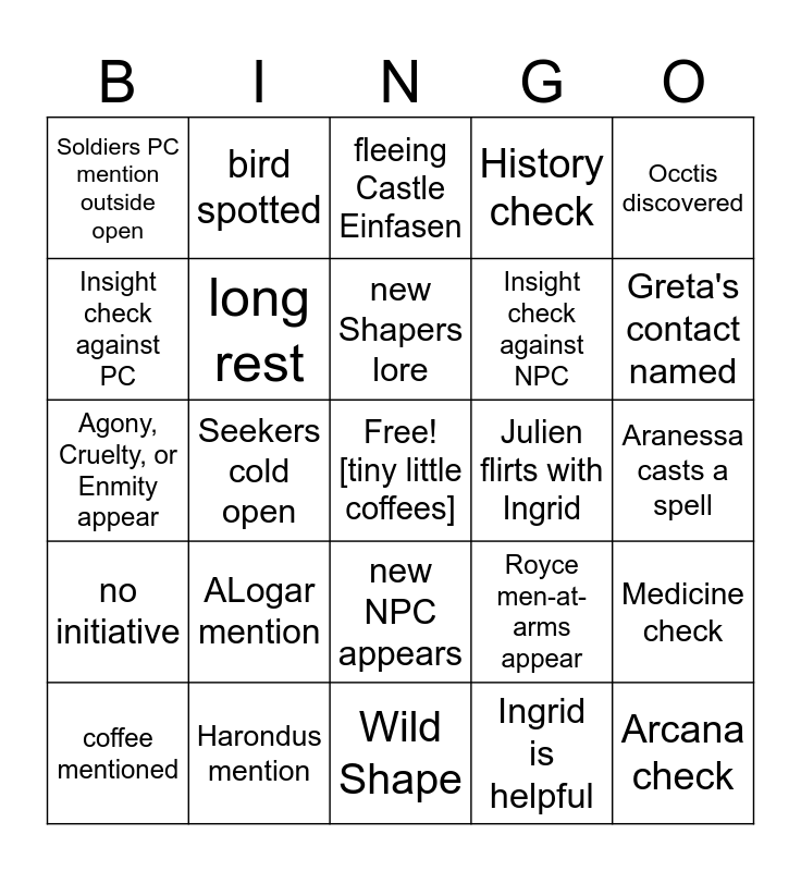 This bingo card has a free space and 33 words: Schemers cold open, Soldiers cold open, Seekers cold open, initiative, no initiative, long rest, Occtis discovered, coffee mentioned, bird spotted, any dramatic irony, new Shapers lore, fleeing Castle Einfasen, new giants / primordials lore, Falconer's Rebellion mention, Julien flirts with Ingrid, Greta's contact named, Harondus mention, Agony, Cruelty, or Enmity appear, ALogar mention, Royce men-at-arms appear, new NPC appears, Schemers PC mention outside open, Soldiers PC mention outside open, Aranessa casts a spell, Wild Shape, Arcana check, History check, Insight check against NPC, Insight check against PC, Medicine check, Stealth check, Ingrid is helpful and any Einfasen betrays the group.