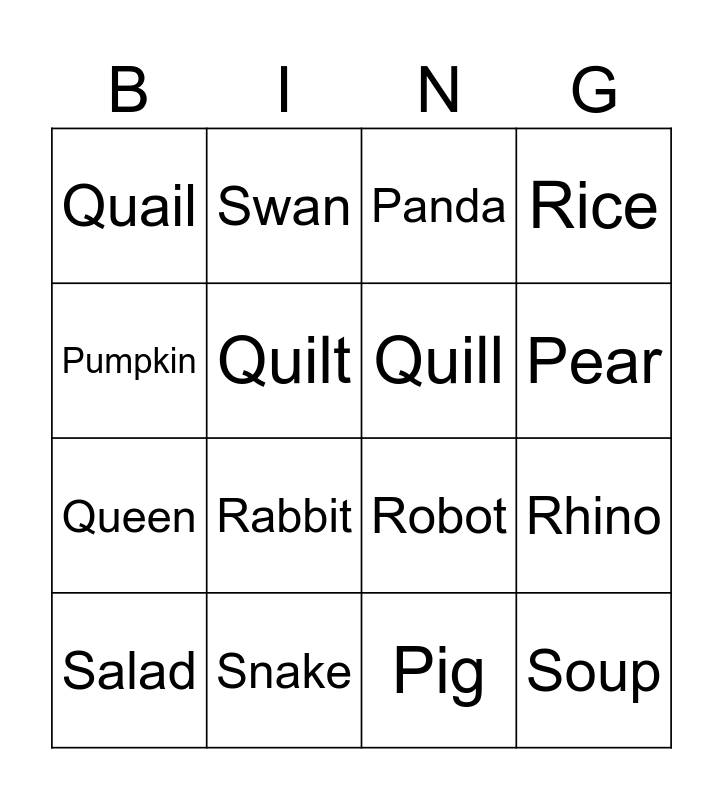 This bingo card has 16 words: Snake, Rhino, Panda, Quail, Queen, Swan, Robot, Pig, Pumpkin, Quilt, Salad, Rice, Rabbit, Pear, Quill and Soup.