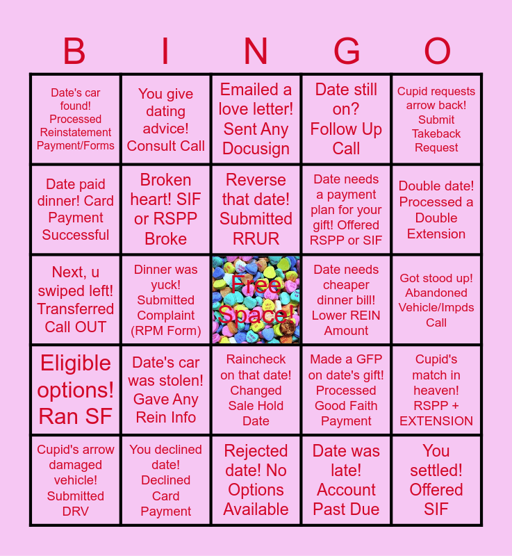 This bingo card has a free space and 24 words: Date's car was stolen! Gave Any Rein Info, You declined date! Declined Card Payment, Reverse that date! Submitted RRUR, Cupid's arrow damaged vehicle! Submitted DRV, Cupid requests arrow back! Submit Takeback Request, Date's car found! Processed Reinstatement Payment/Forms, Date paid dinner! Card Payment Successful, You give dating advice! Consult Call, Date needs cheaper dinner bill! Lower REIN Amount, Raincheck on that date! Changed Sale Hold Date, Date needs a payment plan for your gift! Offered RSPP or SIF, Next, u swiped left! Transferred Call OUT, Made a GFP on date's gift! Processed Good Faith Payment, Cupid's match in heaven! RSPP + EXTENSION, Broken heart! SIF or RSPP Broke, Date was late! Account Past Due, Got stood up! Abandoned Vehicle/Impds Call, Emailed a love letter! Sent Any Docusign, Double date! Processed a Double Extension, Dinner was yuck! Submitted Complaint (RPM Form), You settled! Offered SIF, Eligible options! Ran SF, Date still on? Follow Up Call and Rejected date! No Options Available.