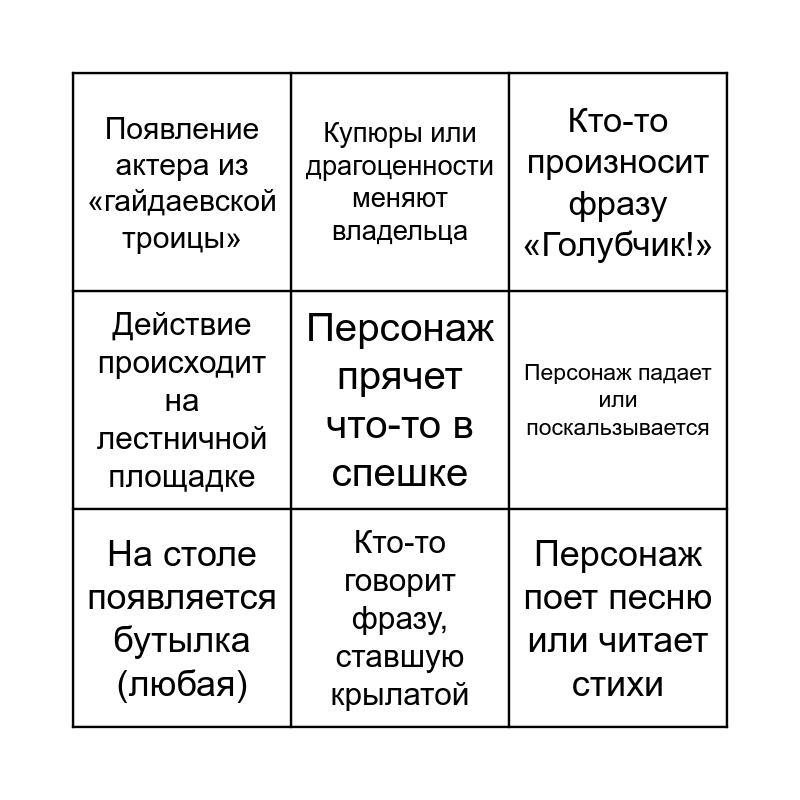 This bingo card has a free space and 8 words: Персонаж падает или поскальзывается, Кто-то произносит фразу «Голубчик!», Купюры или драгоценности меняют владельца, На столе появляется бутылка (любая), Появление актера из «гайдаевской троицы», Персонаж поет песню или читает стихи, Действие происходит на лестничной площадке and Кто-то говорит фразу, ставшую крылатой.