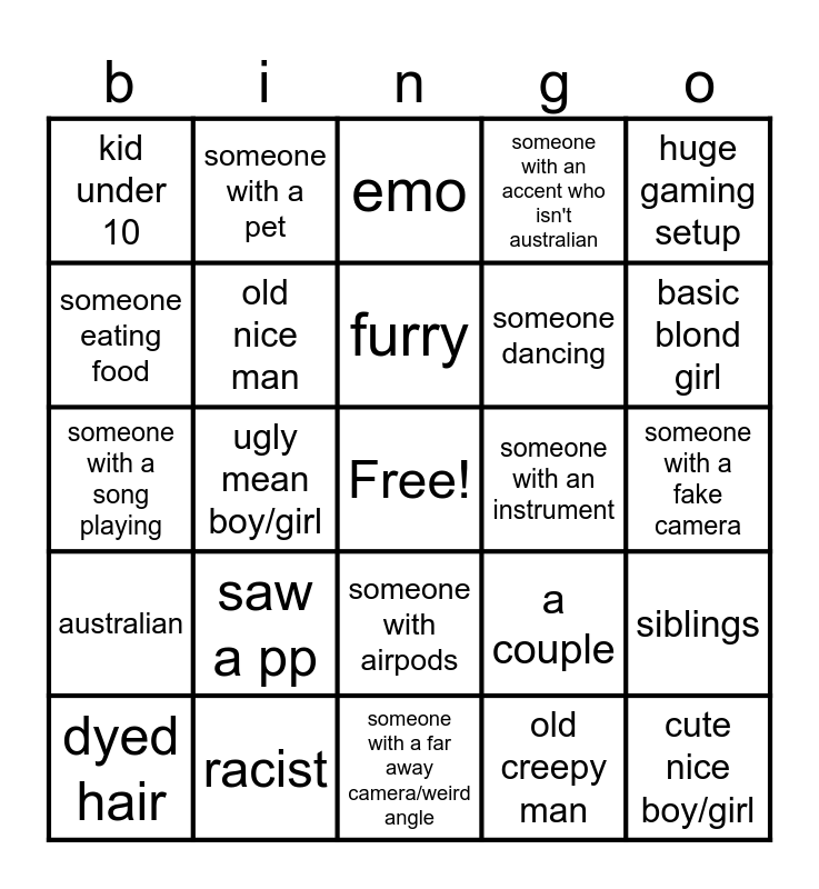 This bingo card has a free space and 24 words: saw a pp, racist, furry, dyed hair, huge gaming setup, kid under 10, someone eating food, someone with a pet, someone with an instrument, someone with airpods, someone dancing, someone with a song playing, a couple, siblings, old nice man, old creepy man, someone with a fake camera, emo, basic blond girl, ugly mean boy/girl, cute nice boy/girl, australian, someone with an accent who isn't australian and someone with a far away camera/weird angle.