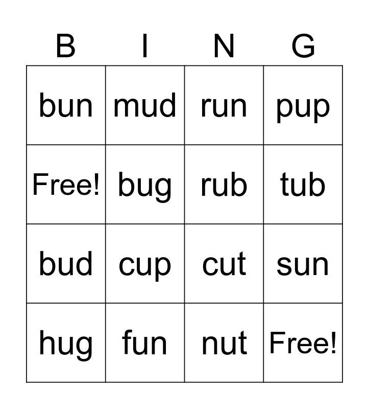 This bingo card has 16 words: fun, sun, run, bun, bud, mud, cut, nut, Free!, bug, hug, pup, cup, tub, rub and Free!.