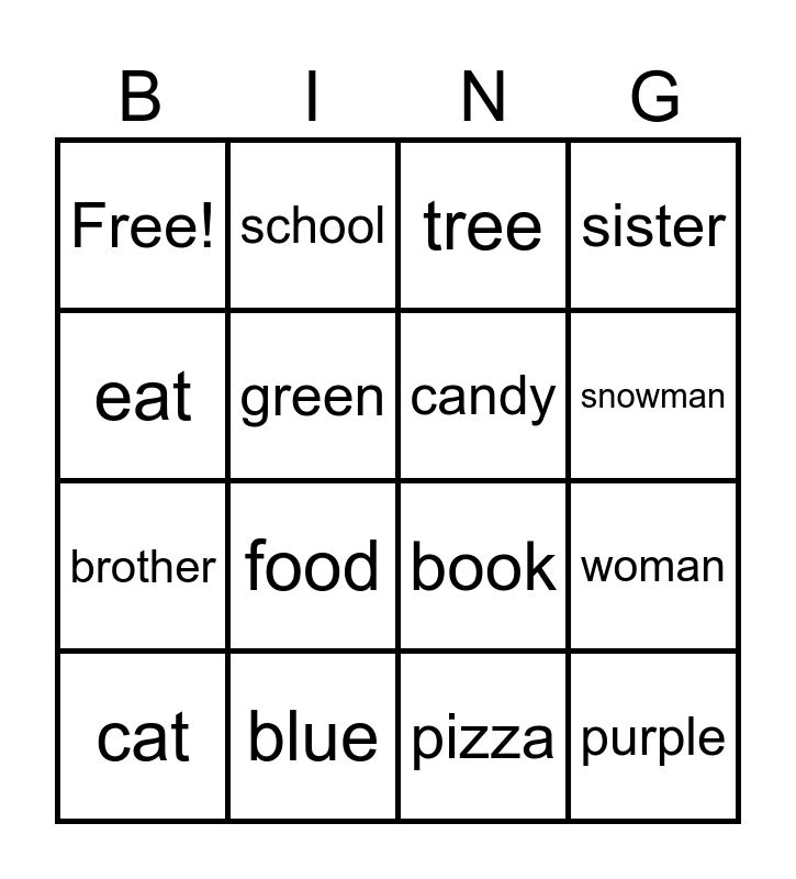 This bingo card has 21 words: brother, pink, candy, purple, cat, school, tree, sister, Free!, green, pizza, snowman, bird, blue, book, dog, food, fish, woman, eat and cake.