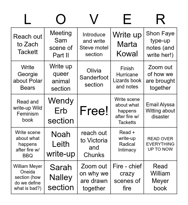 This bingo card has a free space and 24 words: Noah Leith write-up, Sarah Nalley section, Olivia Sanderfoot section, William Meyer Oneida section (how do we define what is bad?), Shon Faye type-up notes (and write her!), Reach out to Zach Tackett, Write Georgie about Polar Bears, Meeting Sam scene of Part II, Write scene about what happens after fire w/ Tacketts, reach out to Victoria and Chunks, Finish Hurricane Lizards book and notes, Read and write-up Wild Feminism book, Read + write-up Radical Intimacy, READ OVER EVERYTHING UP TO NOW, Write up queer animal section, Fire - chief crazy scenes of fire, Email Alyssa Witting about disaster, Introduce and write Steve motel section, Zoom out of how we are brought together, Wendy Erb section, Read William Meyer book, Write scene about what happens after fire w/ BBQ, Write up Marta Kowal and Zoom out on why we are drawn together.