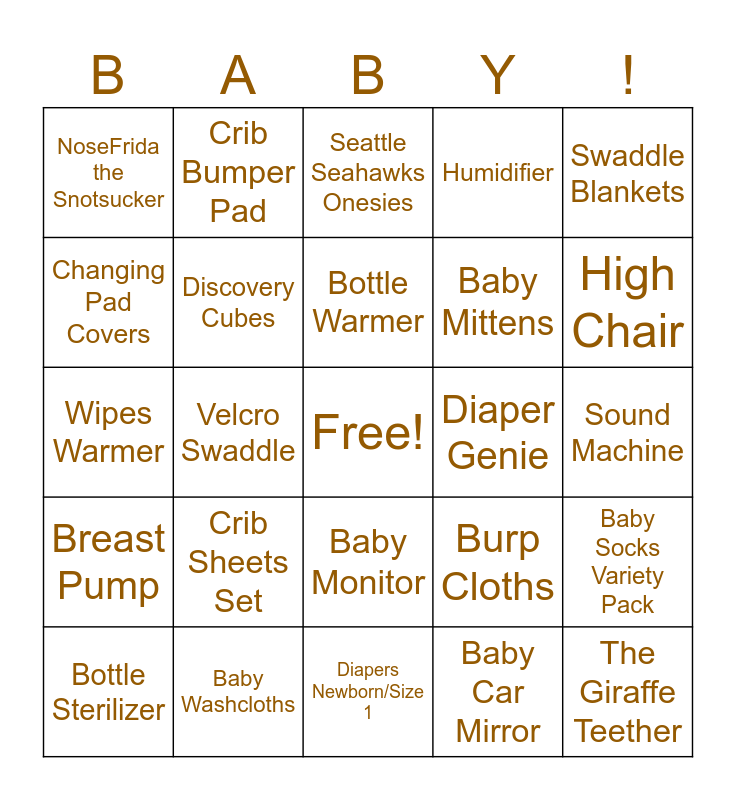 This bingo card has a free space and 30 words: Baby Washcloths, Baby Ear Protection, Velcro Swaddle, Nursery Thermometer, NoseFrida the Snotsucker, Seattle Seahawks Onesies, Discovery Cubes, Baby Monitor, Diaper Genie, Diapers Newborn/Size 1, Sound Machine, The Giraffe Teether, Baby Car Mirror, Backpack Diaper Bag, High Chair, Nursing Cover, Burp Cloths, Breast Pump, Crib Sheets Set, Swaddle Blankets, Wipes Warmer, Stroller Organizer, Crib Bumper Pad, Baby Mittens, Changing Pad Covers, Humidifier, Baby Socks Variety Pack, Bottle Sterilizer, Bottle Warmer and Baby Gate.