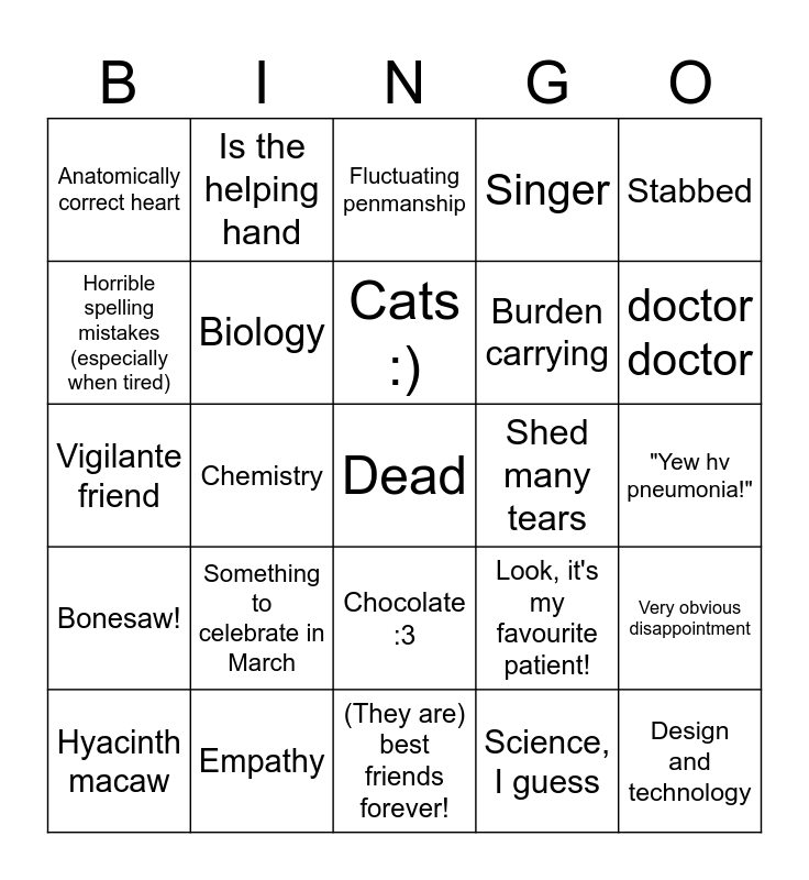 This bingo card has a free space and 24 words: Something to celebrate in March, Empathy, Cats :), Hyacinth macaw, Stabbed, Anatomically correct heart, Horrible spelling mistakes (especially when tired), Is the helping hand, Shed many tears, Chocolate :3, Burden carrying, Vigilante friend, Look, it's my favourite patient!, Very obvious disappointment, Biology, Science, I guess, "Yew hv pneumonia!", Fluctuating penmanship, doctor doctor, Chemistry, Design and technology, Bonesaw!, Singer and (They are) best friends forever!.