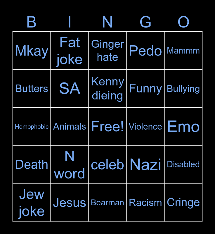 This bingo card has a free space and 24 words: Jew joke, N word, Kenny dieing, Racism, Mammm, Mkay, Fat joke, Ginger hate, Violence, Emo, Homophobic, SA, Nazi, Disabled, Butters, Jesus, Bearman, Pedo, Bullying, Death, Animals, celeb, Funny and Cringe.