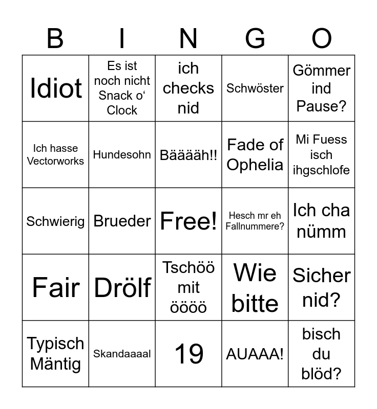 This bingo card has a free space and 26 words: Gömmer goh Rauche?, Drölf, 19, AUAAA!, Mi Fuess isch ihgschlofe, Idiot, Es ist noch nicht Snack o‘ Clock, ich checks nid, Fade of Ophelia, Sicher nid?, Schwierig, Brueder, Wie bitte, bisch du blöd?, Fair, Skandaaaal, Bääääh!!, Hesch mr eh Fallnummere?, Gömmer ind Pause?, Typisch Mäntig, Hundesohn, Tschöö mit öööö, Schwöster, Ich cha nümm, Ich hasse Vectorworks and Ich hasse mein Leben, aber ich liebe mein Job.