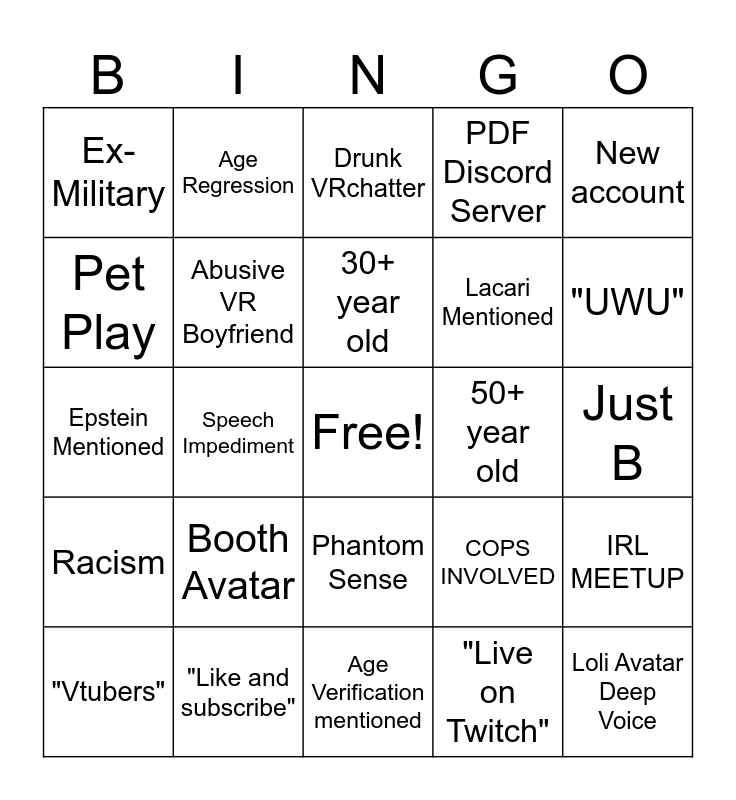 This bingo card has a free space and 49 words: D.I.D. mentioned, Loli Avatar Deep Voice, Golden Gator Member Spotted, Age Verification mentioned, Booth Avatar, Diaper avatar, Age Regression, Anonymous Deep Voice, Pet Play, VR Family, Abusive VR Boyfriend, PDF Discord Server, IRL MEETUP, COPS INVOLVED, "Protect the children", Lovense Mentioned, 30+ year old, 50+ year old, Trump somehow mentioned, New account, Speech Impediment, "Live on Twitch", Ex-Military, Lacari Mentioned, GG Reference, "UWU", "Vtubers", Dan Clancy, Phantom Sense, Racism, Someone cries, Striked in VR, Tomato Thrown, Roblox, "Like and subscribe", Mid-Video AD, Black Cat, Just H Club, Just B, "It's just VR", "Age in bio", Giantess, "discord in Bio", Polymorph Relationship, Epstein Mentioned, Drunk VRchatter, Censored Avatar, Femboy and Mirror Dwellers.