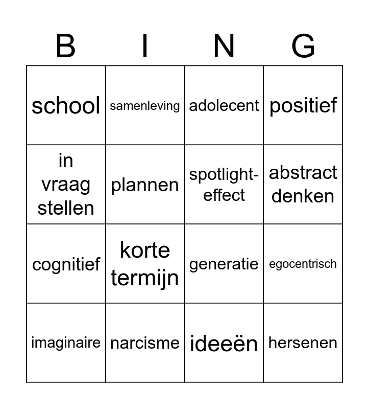 This bingo card has 28 words: tieners, uniek, cognitief, hypothetisch, plannen, adolecent, samenleving, hersenen, narcisme, brein, generatie, positief, uitstellen, denken, korte termijn, ontwikkeling, ingesteldheid, spotlight-effect, abstract denken, waarden, school, flexibel brein, imaginaire, egocentrisch, ideeën, hersengebieden, in vraag stellen and verbindingen.