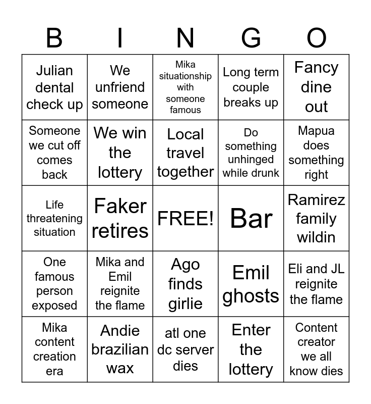 This bingo card has a free space and 24 words: Mika and Emil reignite the flame, Andie brazilian wax, Local travel together, Mika content creation era, Fancy dine out, Julian dental check up, Someone we cut off comes back, We unfriend someone, Bar, Ago finds girlie, Do something unhinged while drunk, Life threatening situation, Emil ghosts, Eli and JL reignite the flame, We win the lottery, Enter the lottery, Ramirez family wildin, Mika situationship with someone famous, Mapua does something right, Faker retires, Content creator we all know dies, One famous person exposed, Long term couple breaks up and atl one dc server dies.