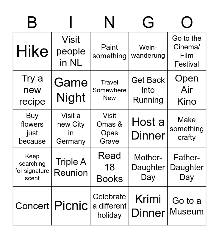 This bingo card has a free space and 24 words: Triple A Reunion, Picnic, Travel Somewhere New, Concert, Go to the Cinema/ Film Festival, Hike, Try a new recipe, Visit people in NL, Host a Dinner, Read 18 Books, Get Back into Running, Buy flowers just because, Mother-Daughter Day, Father- Daughter Day, Game Night, Krimi Dinner, Make something crafty, Paint something, Open Air Kino, Visit a new City in Germany, Go to a Museum, Keep searching for signature scent, Wein-wanderung and Celebrate a different holiday.