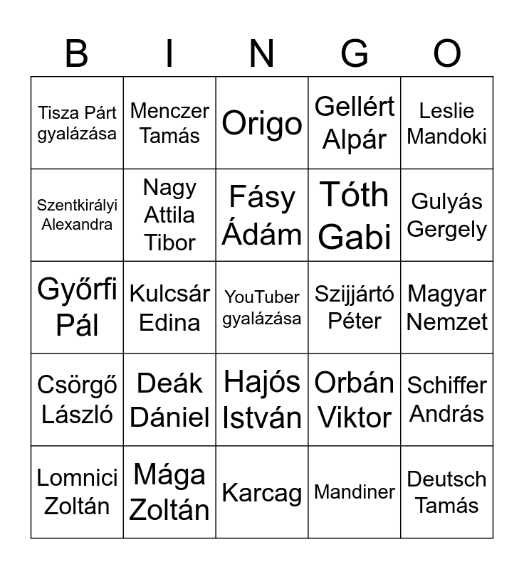 This bingo card has a free space and 24 words: Deák Dániel, Mága Zoltán, Fásy Ádám, Lomnici Zoltán, Leslie Mandoki, Tisza Párt gyalázása, Szentkirályi Alexandra, Menczer Tamás, Szijjártó Péter, Hajós István, Tóth Gabi, Győrfi Pál, Orbán Viktor, Schiffer András, Nagy Attila Tibor, Mandiner, Magyar Nemzet, Origo, Gulyás Gergely, Kulcsár Edina, Deutsch Tamás, Csörgő László, Gellért Alpár and Karcag.