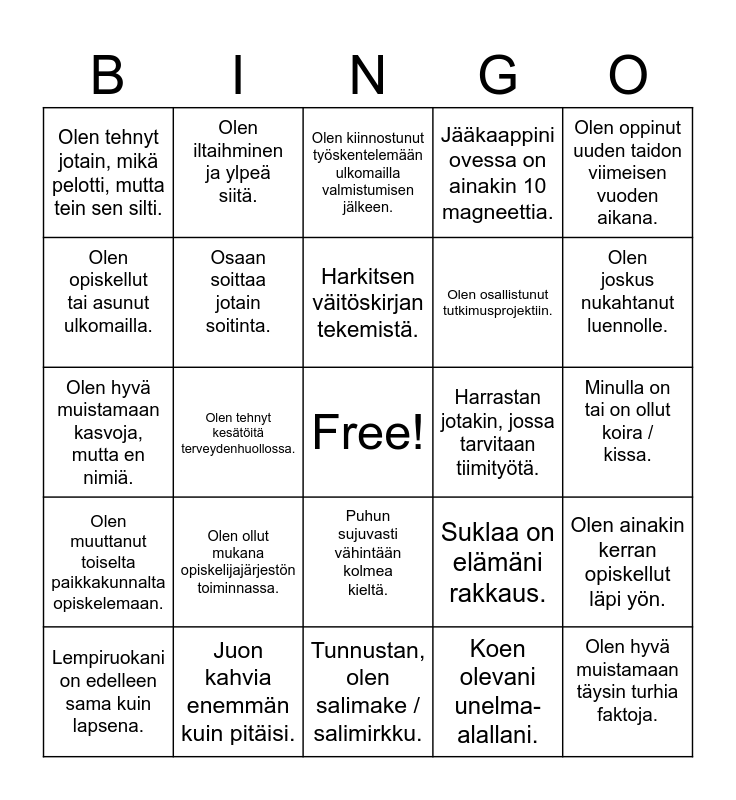 This bingo card has a free space and 24 words: Olen ollut mukana opiskelijajärjestön toiminnassa., Juon kahvia enemmän kuin pitäisi., Harkitsen väitöskirjan tekemistä., Lempiruokani on edelleen sama kuin lapsena., Olen oppinut uuden taidon viimeisen vuoden aikana., Olen tehnyt jotain, mikä pelotti, mutta tein sen silti., Olen opiskellut tai asunut ulkomailla., Olen iltaihminen ja ylpeä siitä., Harrastan jotakin, jossa tarvitaan tiimityötä., Puhun sujuvasti vähintään kolmea kieltä., Olen osallistunut tutkimusprojektiin., Olen hyvä muistamaan kasvoja, mutta en nimiä., Suklaa on elämäni rakkaus., Olen ainakin kerran opiskellut läpi yön., Osaan soittaa jotain soitinta., Koen olevani unelma-alallani., Minulla on tai on ollut koira / kissa., Olen kiinnostunut työskentelemään ulkomailla valmistumisen jälkeen., Olen joskus nukahtanut luennolle., Olen tehnyt kesätöitä terveydenhuollossa., Olen hyvä muistamaan täysin turhia faktoja., Olen muuttanut toiselta paikkakunnalta opiskelemaan., Jääkaappini ovessa on ainakin 10 magneettia. and Tunnustan, olen salimake / salimirkku..