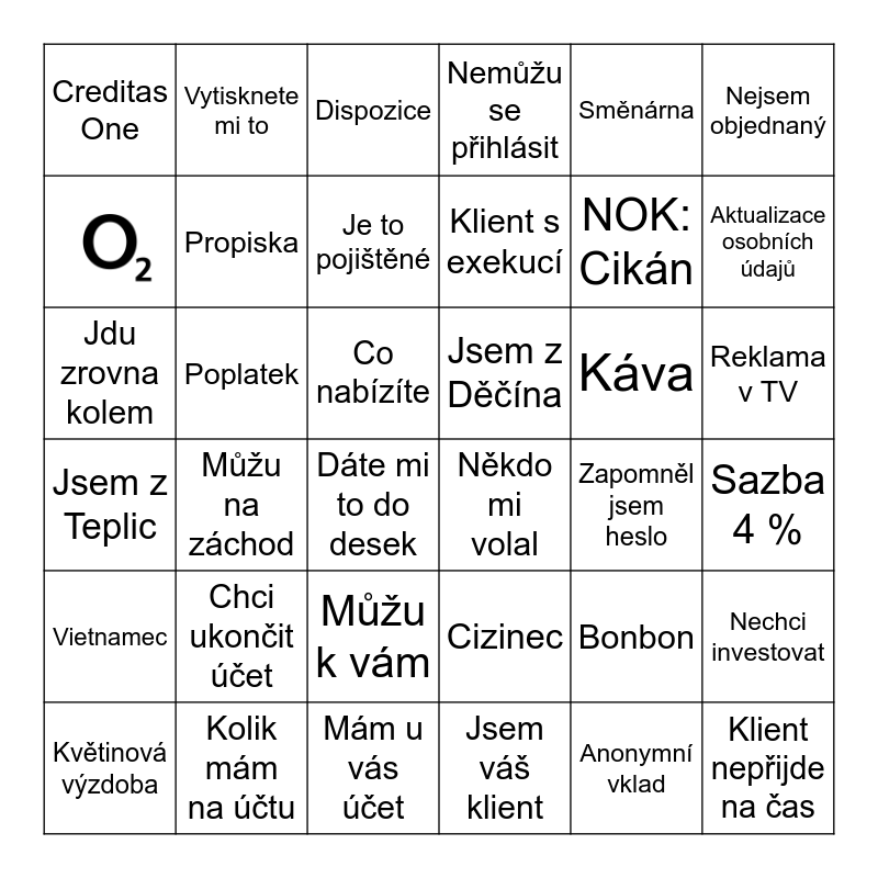 This bingo card has 1 images and 35 words: Cizinec, Můžu k vám, Jsem váš klient, Jsem z Teplic, Jsem z Děčína, Propiska, Mám u vás účet, Směnárna, Bonbon, Aktualizace osobních údajů, Nemůžu se přihlásit, Nechci investovat, Poplatek, Klient s exekucí, Creditas One, Vietnamec, Káva, Jdu zrovna kolem, Dispozice, Co nabízíte, Můžu na záchod, Někdo mi volal, Dáte mi to do desek, Zapomněl jsem heslo, Vytisknete mi to, NOK: Cikán, Kolik mám na účtu, Je to pojištěné, Nejsem objednaný, Klient nepřijde na čas, Květinová výzdoba, Sazba 4 %, Reklama v TV, Chci ukončit účet and Anonymní vklad.