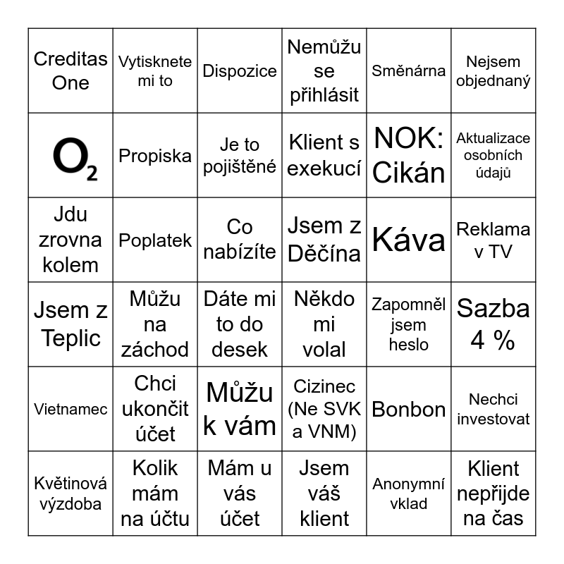 This bingo card has 1 images and 35 words: Cizinec (Ne SVK a VNM), Můžu k vám, Jsem váš klient, Jsem z Teplic, Jsem z Děčína, Propiska, Mám u vás účet, Směnárna, Bonbon, Aktualizace osobních údajů, Nemůžu se přihlásit, Nechci investovat, Poplatek, Klient s exekucí, Creditas One, Vietnamec, Káva, Jdu zrovna kolem, Dispozice, Co nabízíte, Můžu na záchod, Někdo mi volal, Dáte mi to do desek, Zapomněl jsem heslo, Vytisknete mi to, NOK: Cikán, Kolik mám na účtu, Je to pojištěné, Nejsem objednaný, Klient nepřijde na čas, Květinová výzdoba, Sazba 4 %, Reklama v TV, Chci ukončit účet and Anonymní vklad.