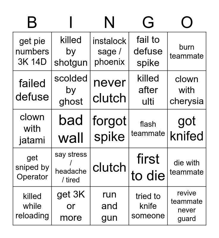 This bingo card has 25 words: say stress / headache / tired, run and gun, never clutch, killed while reloading, burn teammate, get pie numbers 3K 14D, failed defuse, killed by shotgun, flash teammate, clutch, killed after ulti, clown with jatami, first to die, die with teammate, scolded by ghost, revive teammate never guard, got knifed, instalock sage / phoenix, clown with cherysia, bad wall, forgot spike, get 3K or more, get sniped by Operator, fail to defuse spike and tried to knife someone.