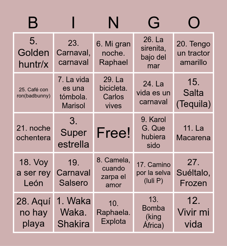 This bingo card has a free space and 30 words: 1. Waka Waka. Shakira, 2. APT. Bruno Mars, 3. Super estrella, 4. Bonito. Jarabe de palo, 5. Golden huntr/x, 6. Mi gran noche. Raphael, 7. La vida es una tómbola. Marisol, 8. Camela, cuando zarpa el amor, 9. Karol G. Que hubiera sido, 10. Raphaela. Explota, 11. La Macarena, 12. Vivir mi vida, 13. Bomba (king África), 14. Madre tierra, 15. Salta (Tequila), 16. La Bamba, 17. Camino por la selva (luli P), 18. Voy a ser rey León, 19. Carnaval Salsero, 20. Tengo un tractor amarillo, 21. noche ochentera, 22. Cómo una ola, 23. Carnaval, carnaval, 24. La vida es un carnaval, 25. Café con ron(badbunny), 26. La sirenita, bajo del mar, 27. Suéltalo, Frozen, 28. Aquí no hay playa, 29. La bicicleta. Carlos vives and 30. Soy una serpiente. Luli Pampin.