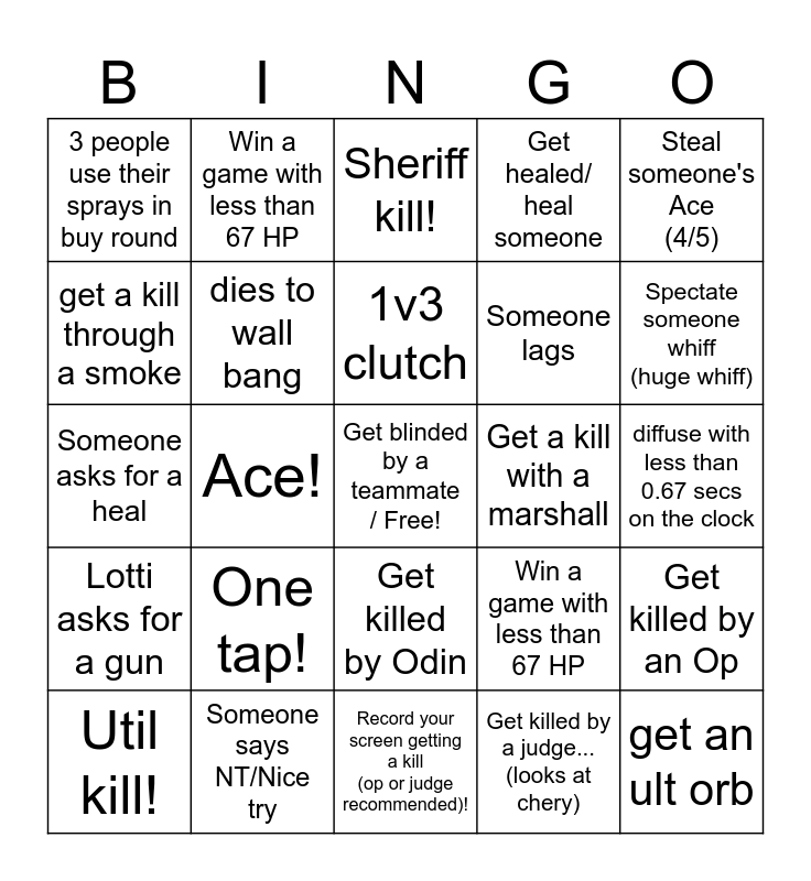 This bingo card has a free space and 24 words: One tap!, Someone says NT/Nice try, 1v3 clutch, Util kill!, Steal someone's Ace (4/5), 3 people use their sprays in buy round, get a kill through a smoke, Win a game with less than 67 HP, Get a kill with a marshall, Get killed by Odin, Someone lags, Someone asks for a heal, Win a game with less than 67 HP, Get killed by an Op, dies to wall bang, Get killed by a judge... (looks at chery), diffuse with less than 0.67 secs on the clock, Sheriff kill!, Spectate someone whiff (huge whiff), Ace!, get an ult orb, Lotti asks for a gun, Get healed/ heal someone and Record your screen getting a kill (op or judge recommended)!.