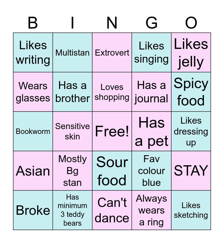 This bingo card has a free space and 24 words: Mostly Bg stan, Has minimum 3 teddy bears, Loves shopping, Broke, Likes jelly, Likes writing, Wears glasses, Multistan, Has a pet, Sour food, Has a journal, Bookworm, Fav colour blue, STAY, Has a brother, Always wears a ring, Likes dressing up, Extrovert, Spicy food, Sensitive skin, Likes sketching, Asian, Likes singing and Can't dance.
