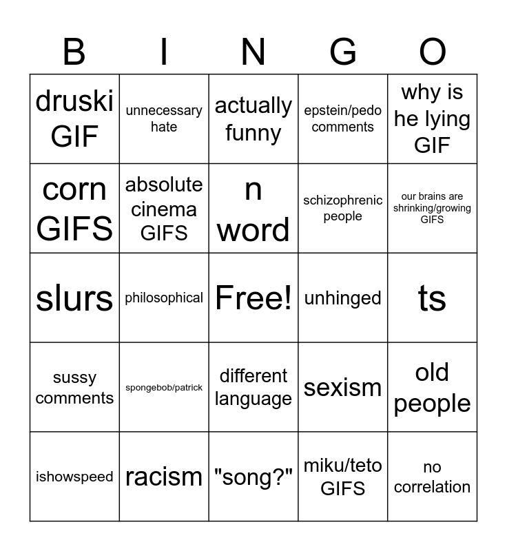 This bingo card has a free space and 24 words: spongebob/patrick, racism, n word, ishowspeed, why is he lying GIF, druski GIF, corn GIFS, unnecessary hate, unhinged, different language, schizophrenic people, slurs, sexism, old people, absolute cinema GIFS, miku/teto GIFS, ts, actually funny, our brains are shrinking/growing GIFS, philosophical, no correlation, sussy comments, epstein/pedo comments and "song?".