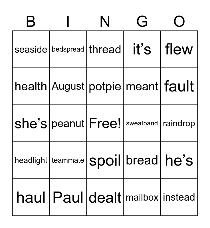 This bingo card has a free space and 27 words: bread, sweat, meant, dealt, health, thread, bedspread, headlight, sweatband, he’s, she’s, it’s, haul, Paul, fault, launch, August, potpie, teammate, seaside, raindrop, mailbox, peanut, instead, spoil, flew and pancake.