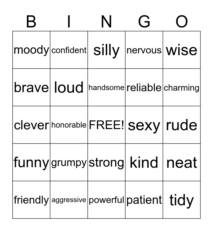 This bingo card has a free space and 24 words: grumpy, aggressive, handsome, friendly, wise, moody, brave, confident, sexy, strong, reliable, clever, kind, neat, loud, patient, rude, silly, charming, honorable, tidy, funny, nervous and powerful.